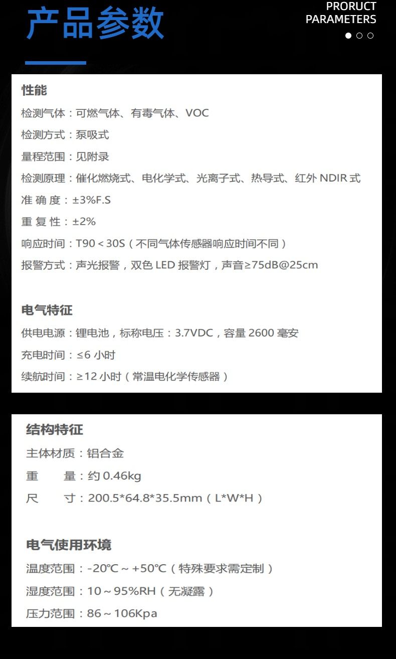 续航时间:≥12 小时(常温电化学传感器)