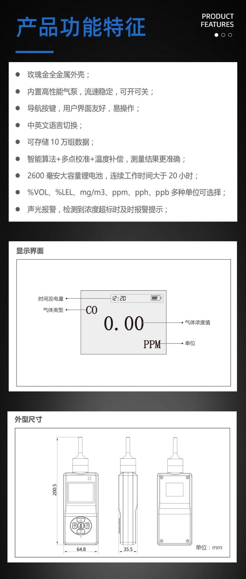 %VOL、%LEL、mg/m3、ppm、pph、ppb 多种单位可选择;